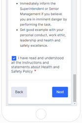 You can provide information about your H&S policy, Work Rights, OHS Responsibilities, PPE requirements, company rules, and hazard assessments. Compnay safety training made simple. Knowledge checks throughout to confirm understanding, and automatically produces a certificate that can be sent to the worker, compnay safety representatvie and HR.